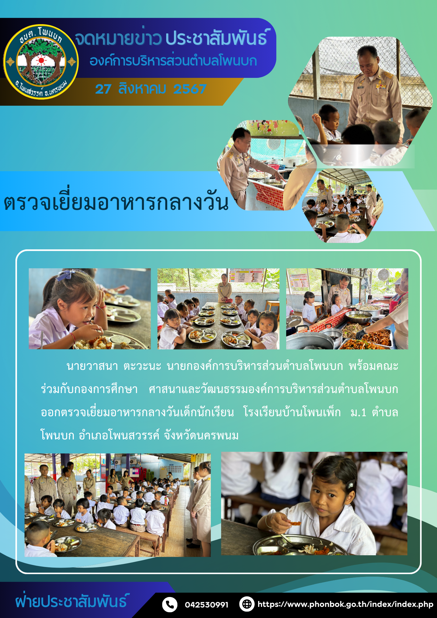 นายวาสนา ตะวะนะ นายกองค์การบริหารส่วนตำบลโพนบก พร้อมคณะ ร่วมกับกองการศึกษา ศาสนาและวัฒนธรรมองค์การบริหารส่วนตำบลโพนบก ออกตรวจเยี่ยมอาหารกลางวันเด็กนักเรียน โรงเรียนบ้านโพนเพ็ก ม.1 ตำบลโพนบก อำเภอโพนสวรรค์... [27 สิงหาคม 2567]
