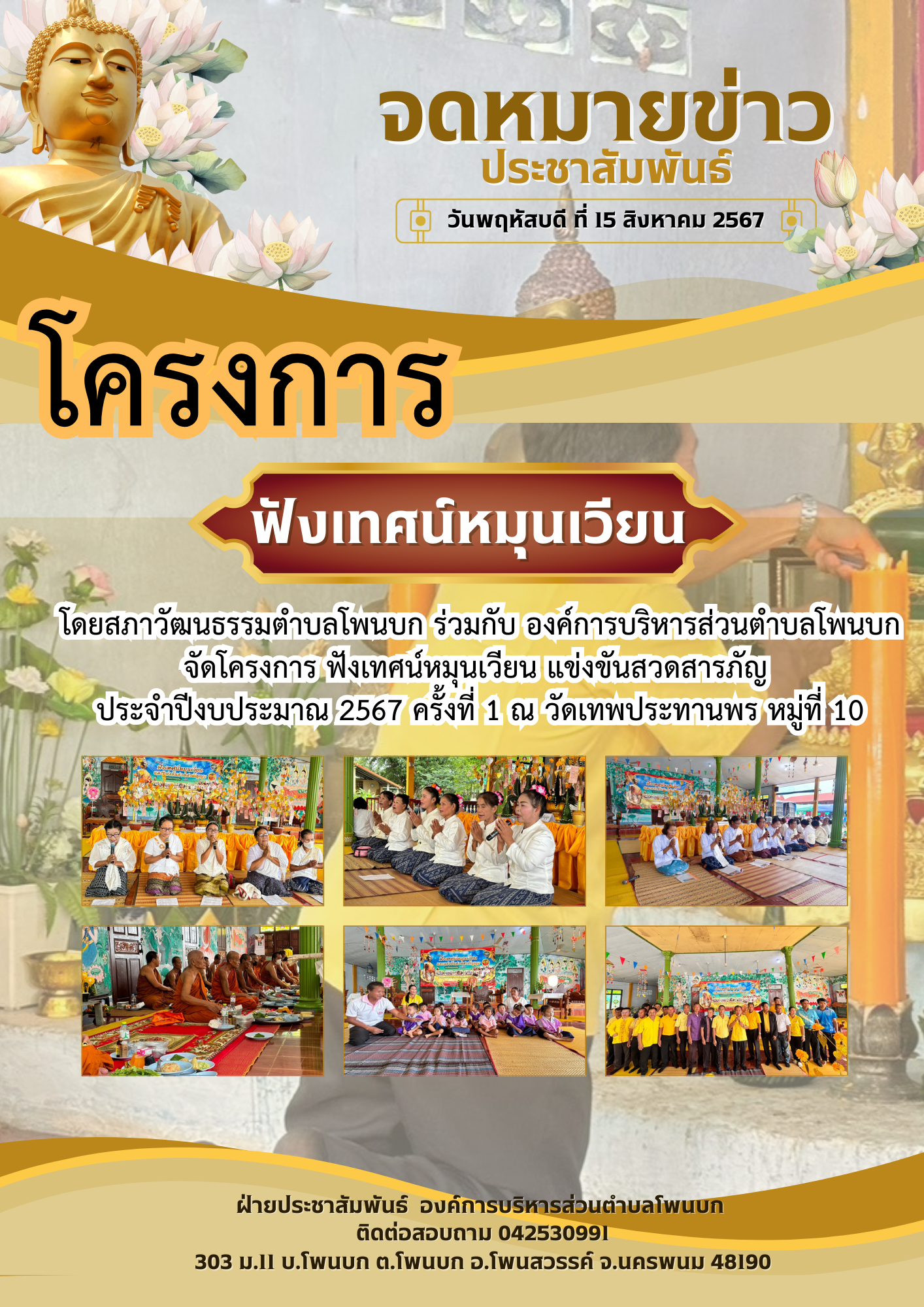 15 สิงหาคม 2567 สภาวัฒนธรรมตำบลโพนบก ร่วมกับ องค์การบริหารส่วนตำบลโพนบก จัดโครงการ ฟังเทศน์หมุนเวียน แข่งขันสวดสารภัญ ประจำปีงบประมาณ 2567 ครั้งที่ 1 ณ วัดเทพประทานพร หมู่ที่ 10 [15 สิงหาคม 2567]