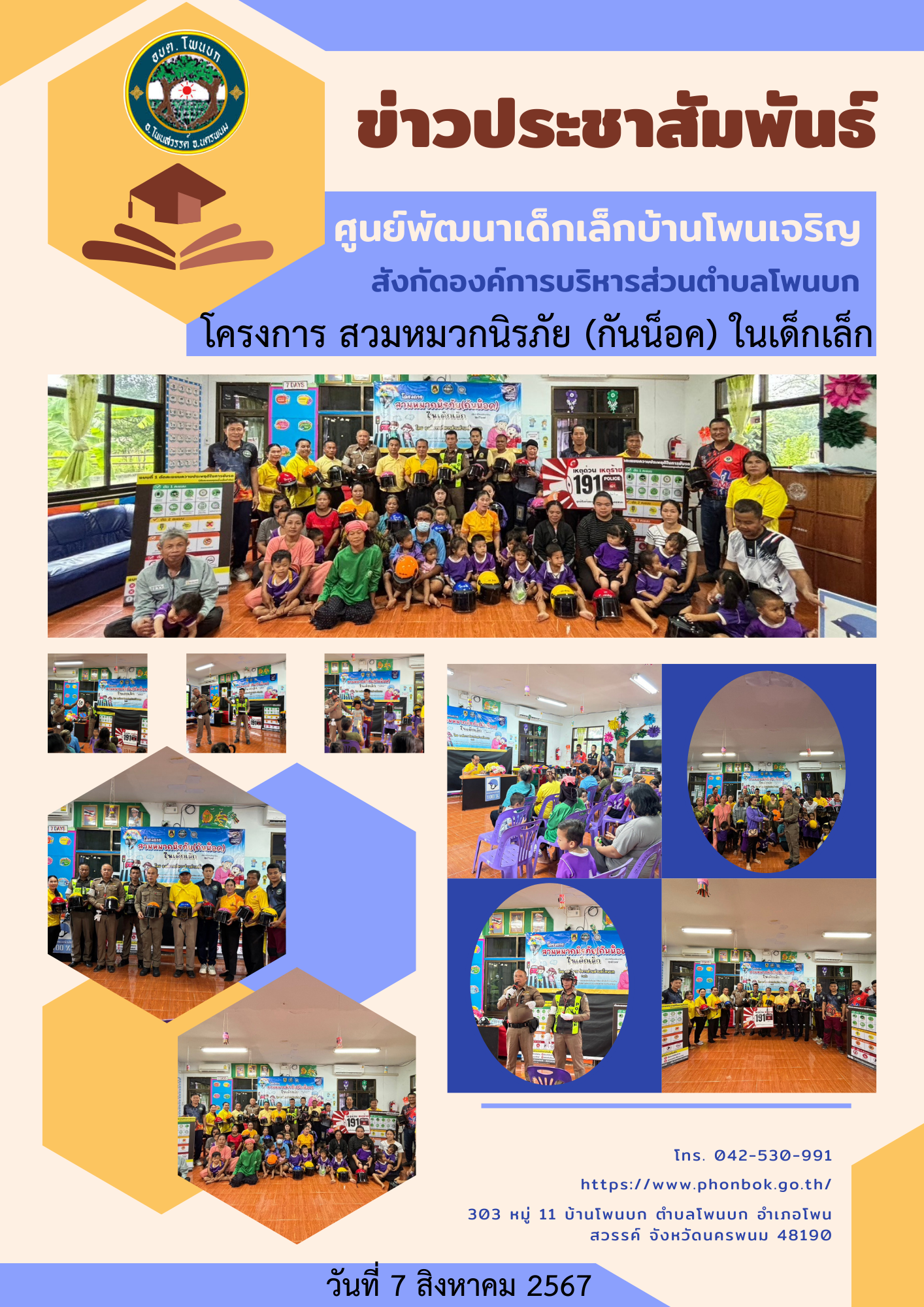 7 สิงหาคม 2567 องค์การบริหารส่วนตำบลโพนบก ร่วมกับ สถานีตำรวจภูธรโพนสวรรค์ ผู้ปกครองและเด็กนักเรียน ครู ผู้ที่เกี่ยวข้อง และประชาชนในพื้นที่ ร่วมโครงการ การสวมหมวกนิรภัย (กันน็อค) ในเด็กเล็ก ประจำปีงบประมาณ 2567 ณ... [7 สิงหาคม 2567]