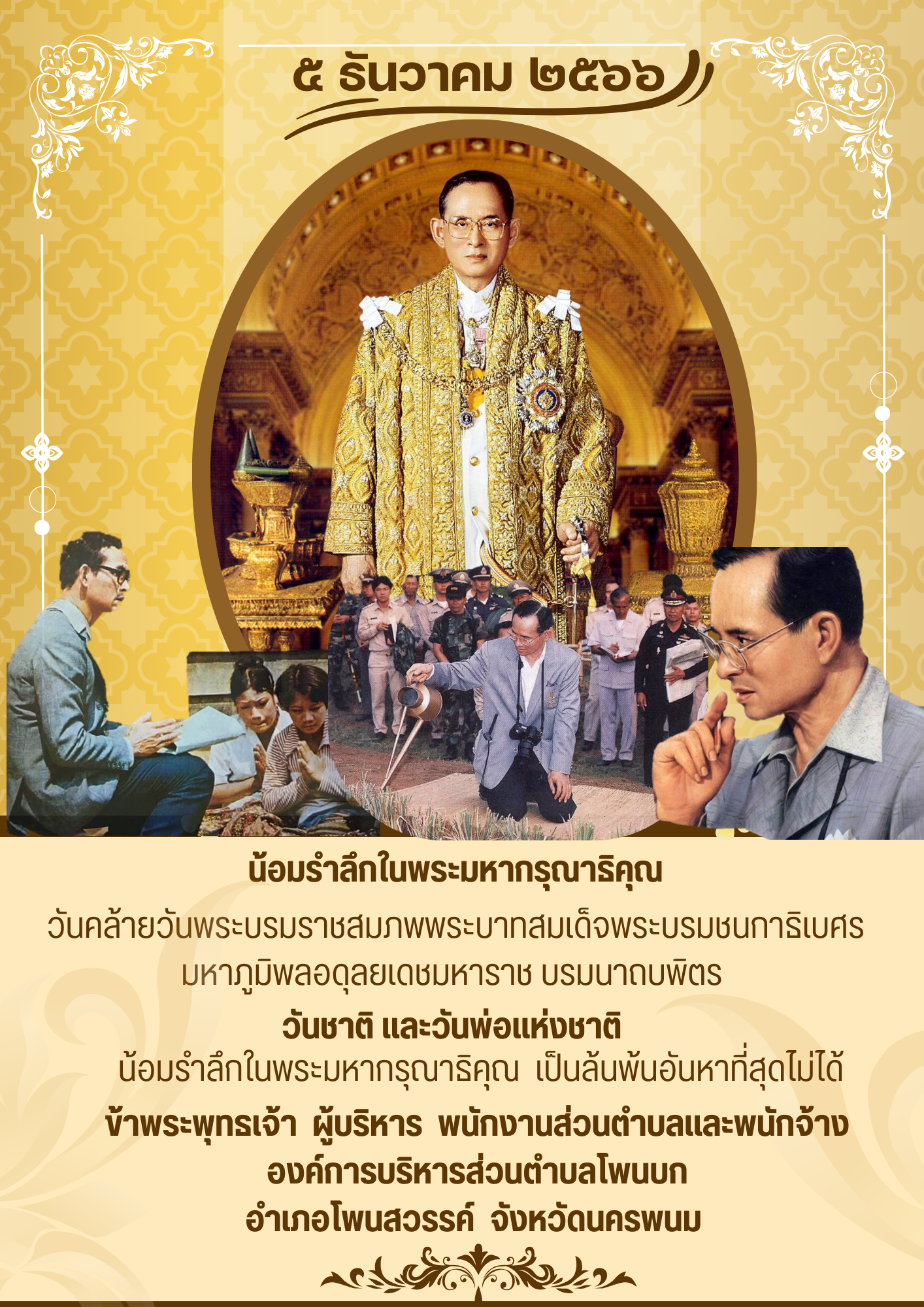 ชื่อเรื่อง : เนื่องในวันคล้ายวันพระบรมราชสมภพของพระบาทสมเด็จพระบรมชนกาธิเบศร มหาภูมิพลอดุลยเดชมหาราช บรมนาถบพิตร วันชาติและวันพ่อแห่งชาติ ในวันที่ ๕ ธันวาคม พุทธศักราช ๒๕๖6 นี้ ข้าพระพุทธเจ้า ผู้บริหารและเจ้าหน้าที่ องค์การบริหารส่วนตำบลโพนบก พร้อมเหล่าพสกนิกรตำบลโพนบก ต่างน้อมจิตตั้งมั่นเพื่อร่วมกันแสดงออกถึงความจงรักภักดี และน้อมรำลึกถึงพระมหากรุณาธิคุณอันหาสุดมิได้ ตลอดระยะเวลา ๗๐ ปี ที่ทรงครองสิริราชสมบัติเป็นพระมหากษัตริย์พระองค์ที่ ๙ แห่งพระบรมราชจักรีวงศ์ พระบาทสมเด็จพระบรมชนกาธิเบศร มหาภูมิพลอดุลยเดชมหาราช บรมนาถบพิตร ทรงปกครองอาณาประชาราษฎร์ใต้ร่มพระบารมีทั่วราชอาณาจักรด้วยทศพิธราชธรรม พระราชกรณียกิจ นานัปการ ที่ทรงทุ่มเทกำลังพระวรกายและพระสติปัญญา เพื่อขจัดความทุกข์ยากทั่วราชอาณาจักรแก่ปวงพสกนิกร และก่อให้เกิดคุณอเนกอนันต์แก่ประเทศชาติ พระมหากรุณาธิคุณและพระเมตตาอันเปี่ยมล้นในพระราชหฤทัย ประจักษ์แจ้งและประทับอยู่ในใจปวงประชา นับเป็นบุญของปวงข้าพระพุทธเจ้าที่ได้มีชีวิตอยู่อย่างผาสุกร่มเย็นบนผืนแผ่นดินไทย ภายใต้ร่มพระบารมีของพระมหากษัตริย์ผู้ทรงพระคุณอันประเสริ