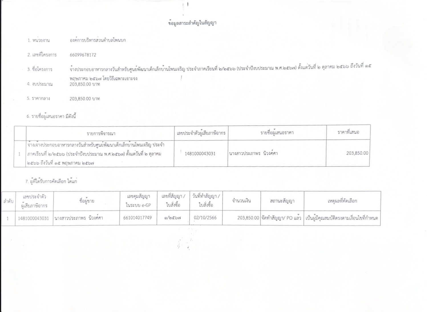 ชื่อเรื่อง : จ้างประกอบอาหารกลางวันสำหรับศูนย์พัฒนาเด็กเล็กบ้านโพนเจริญ ประจำภาคเรียนที่ ๒/๒๕๖๖
