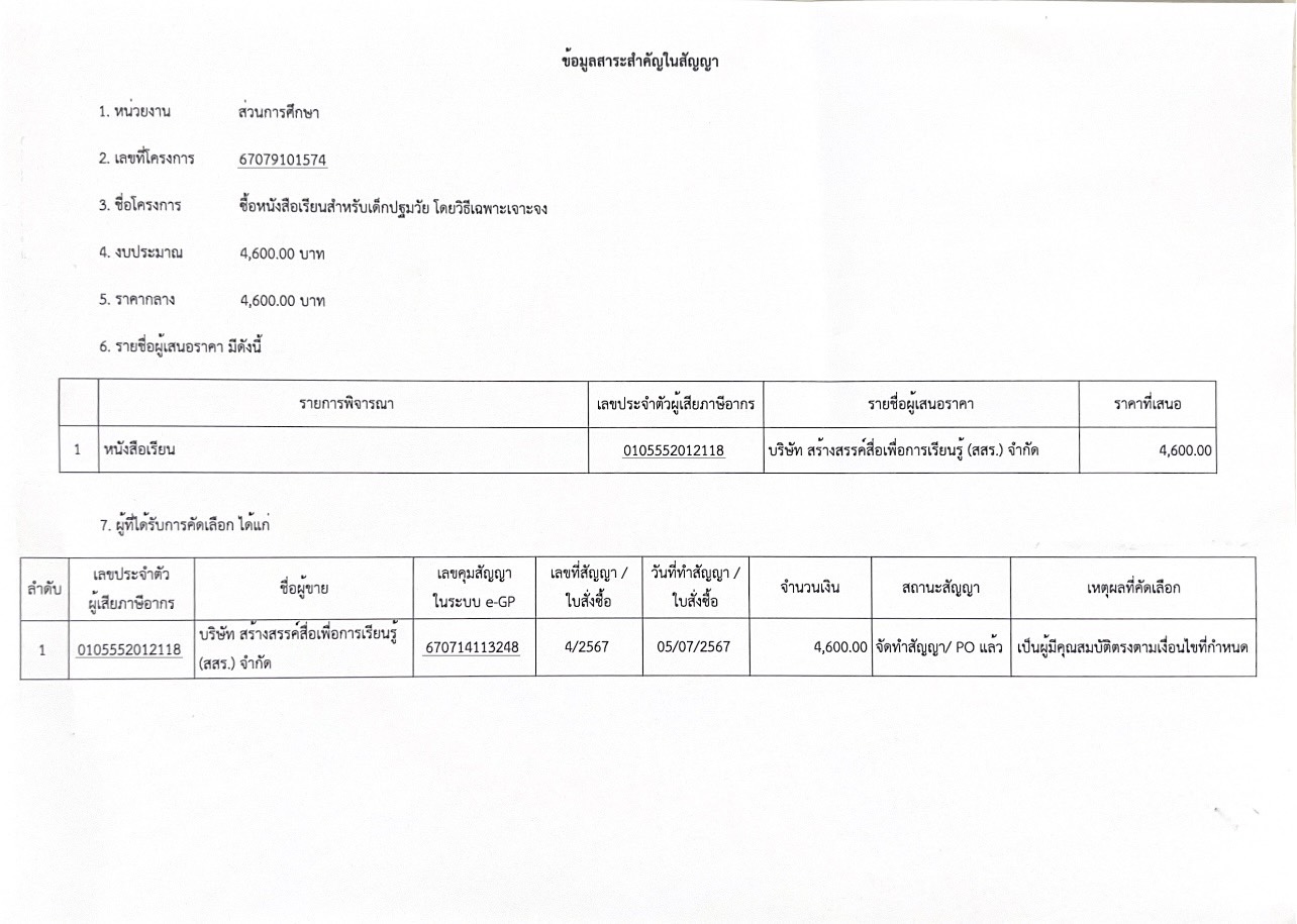 ข้อมูลสาระสำคัญในสัญญา หนังสือเรียนสำหรับเด็กปฐมวัย ประจำปีงบประมาณ ๒๕๖๗