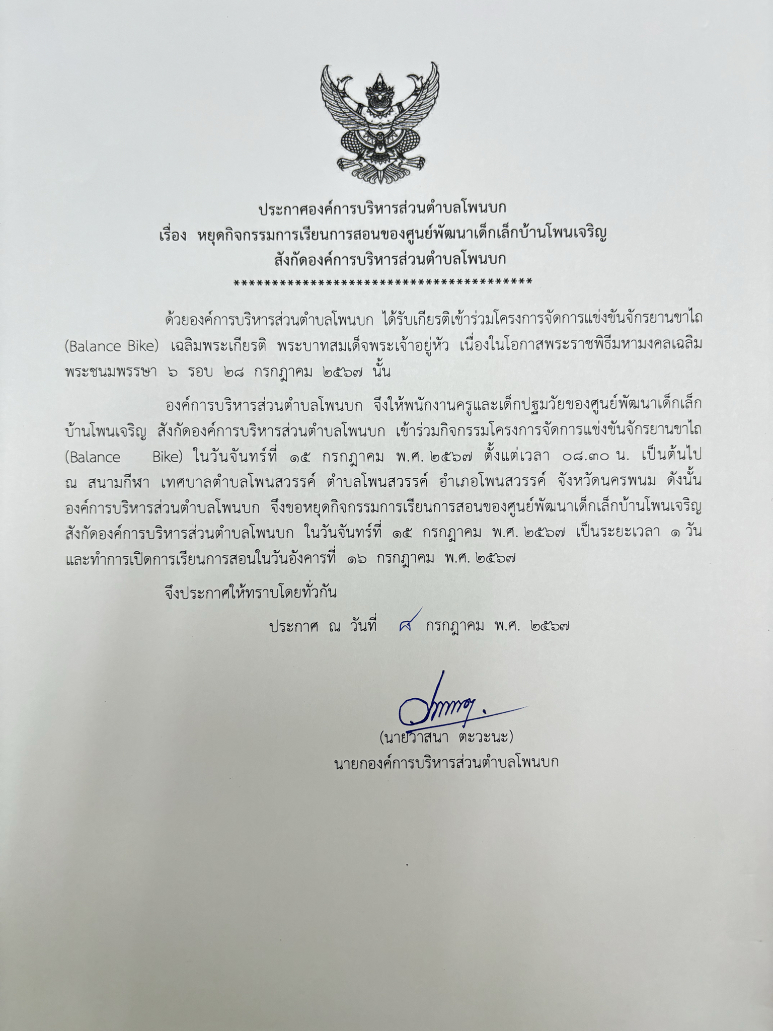 ประกาศ องค์การบริหารส่วนตำบลโพนบก เรื่องหยุดกิจกรรมการเรียนการสอนของศูนย์พัฒนาเด็กเล็กบ้านโพนเจริญ ดังรายละเอียดเอกสารแนบนี้