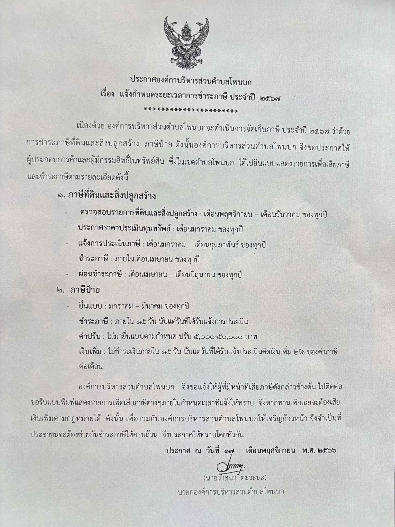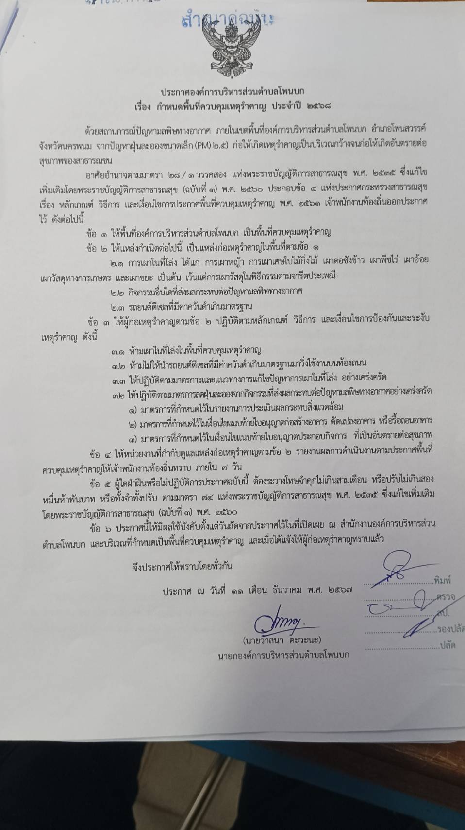 ประกาศองค์การบริหารส่วนตำบลโพนบก กำหนดพื้นที่ควบคุมเหตุรำคาญ ประจำปี 2568