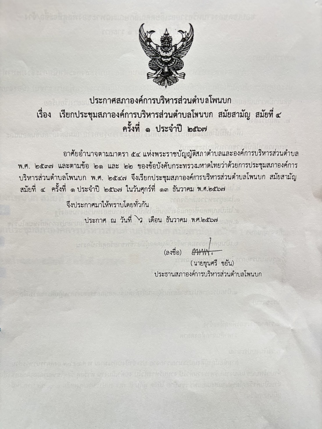 ประกาศ รายงานการประชุมสภาองค์การบริหารส่วนตำบลโพนบก สมัยที่ 4 ครั้งที่ 1/2567