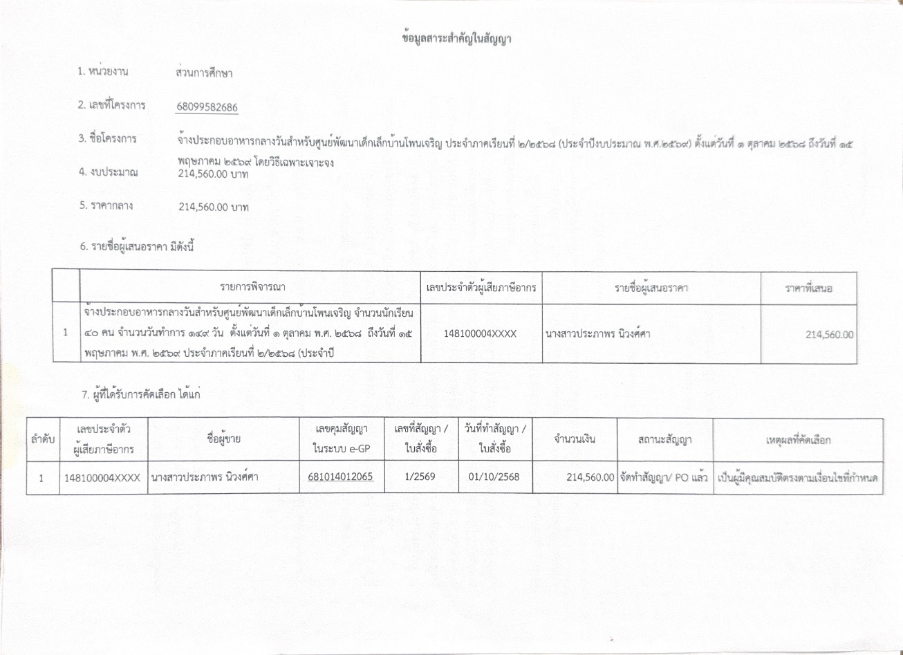 ชื่อเรื่อง : ข้อมูลสาระสำคัญในสัญญา จ้างประกอบอาหารกลางวันสำหรับศูนย์พัฒนาเด็กเล็กบ้านโพนเจริญ (ตั้งแต่วันที่ 1 ตุุลาคม 2568 ถึงวันที่ 15 พฤษภาคม 2569) ประจำภาคเรียนที่ 2/2568 ประจำปังบประมาณ พ.ศ. 2569