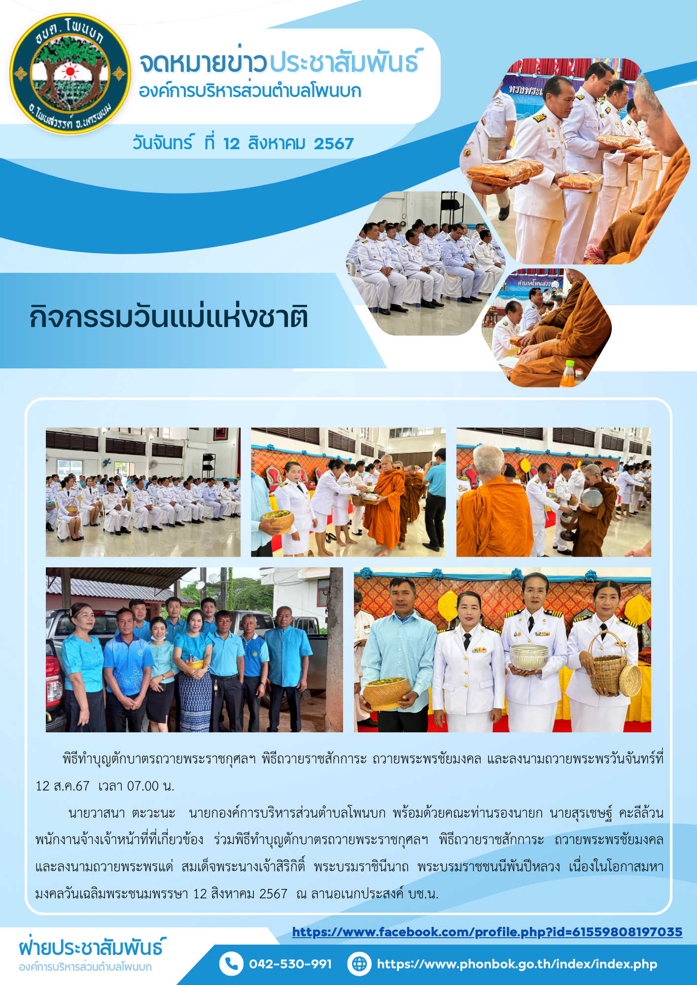 พิธีทำบุญตักบาตรถวายพระราชกุศลฯ พิธีถวายราชสักการะ ถวายพระพรชัยมงคล และลงนามถวายพระพรวันจันทร์ที่ 12 ส.ค.67 เวลา 07.00 น. นายวาสนา ตะวะนะ นายกองค์การบริหารส่วนตำบลโพนบก พร้อมด้วยคณะท่านรองนายก นายสุรเชษฐ์ คะลีล้วน ... [12 สิงหาคม 2567]