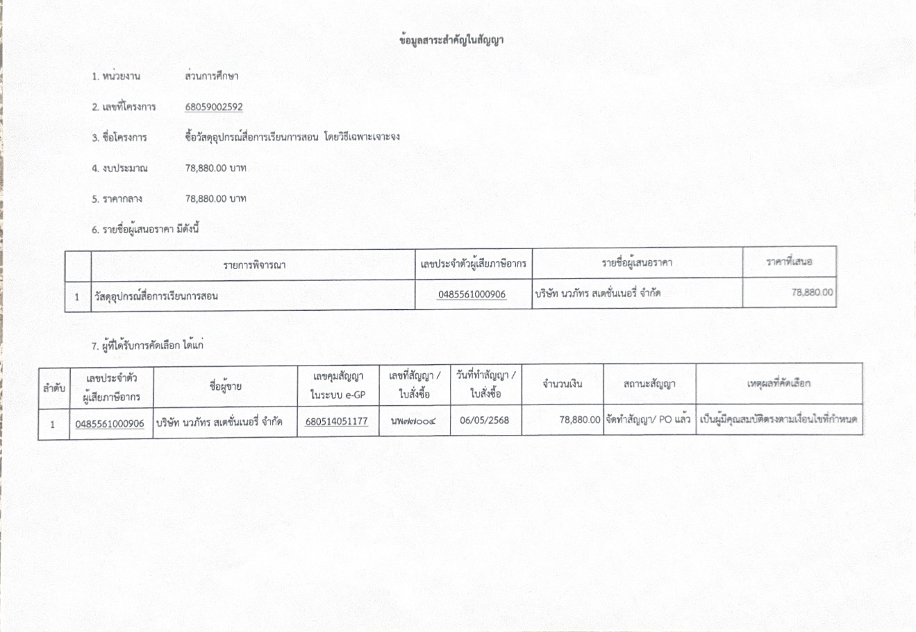 ข้อมูลสาระสำคัญในสัญญา ซื้อวัสดุอุปกรณ์สื่อการเรียนการสอน ประจำปีงบประมาณ 2568